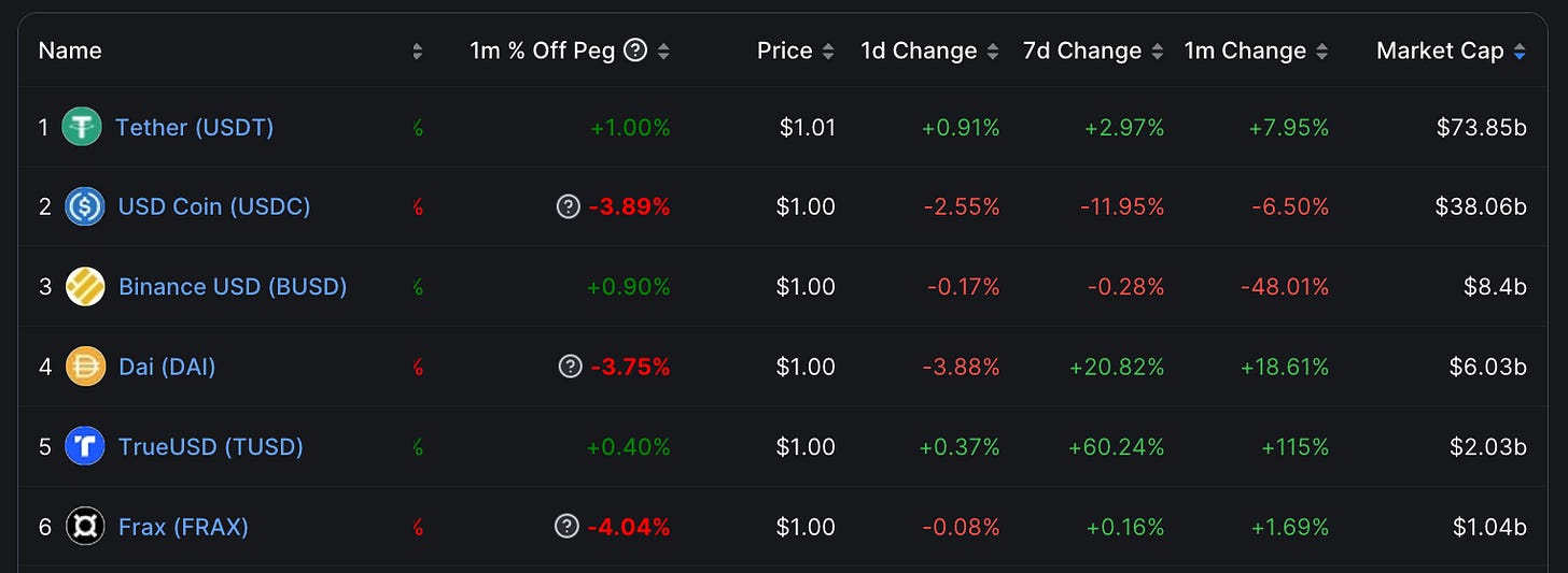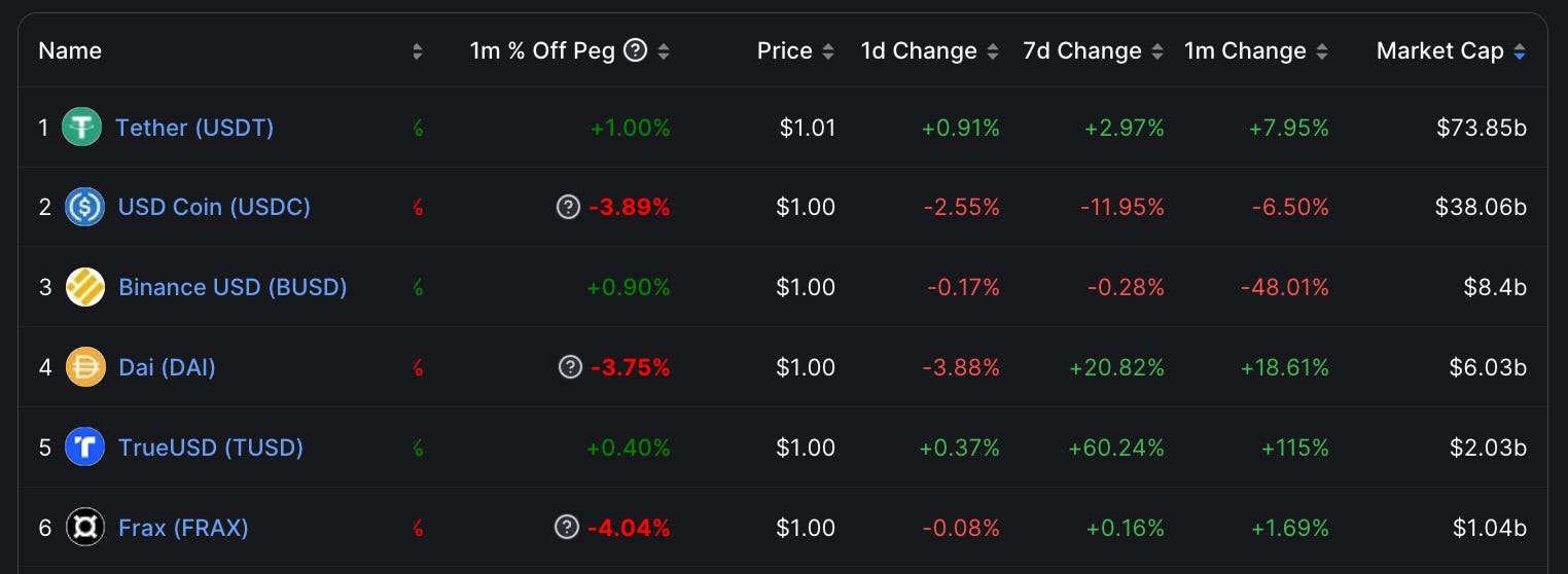 The vast majority of stablecoin's total market cap belongs to fiat-backed stablecoins such as Tether (USDT), USD Coin (USDC), and Binance USD (BUSD).