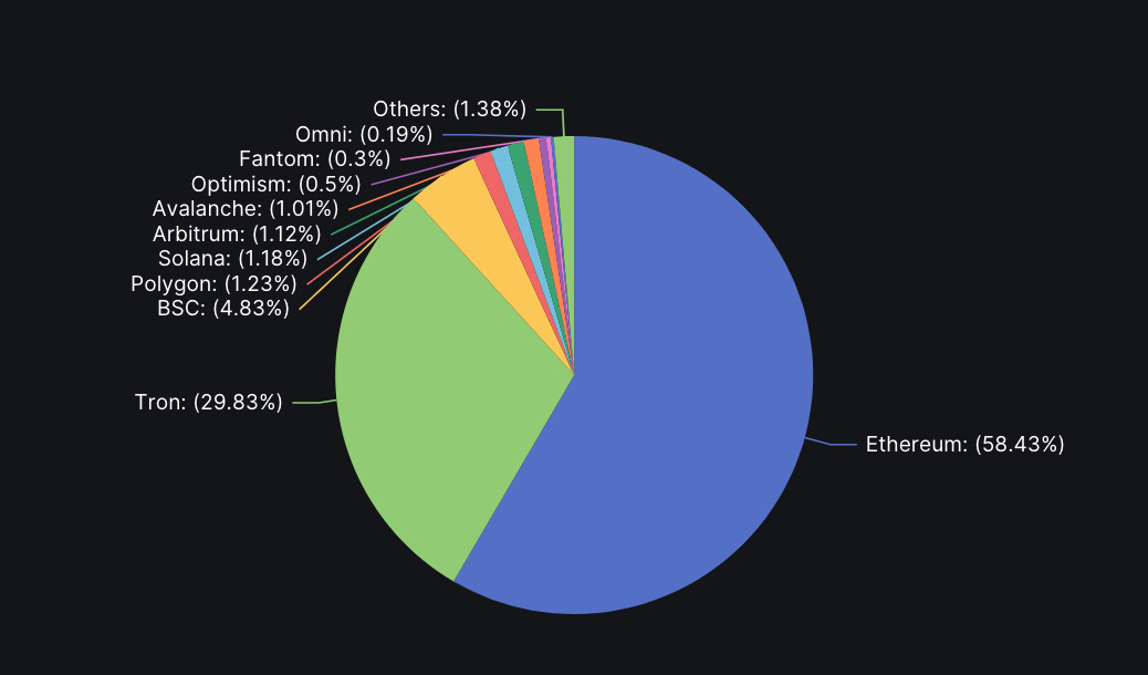 Stablecoins reside on various chains, with Ethereum and Tron chains being the absolute leaders. This can be attributed to the massive usage of stablecoins in DeFi applications on Ethereum, and low fees for sending transactions on Tron.
